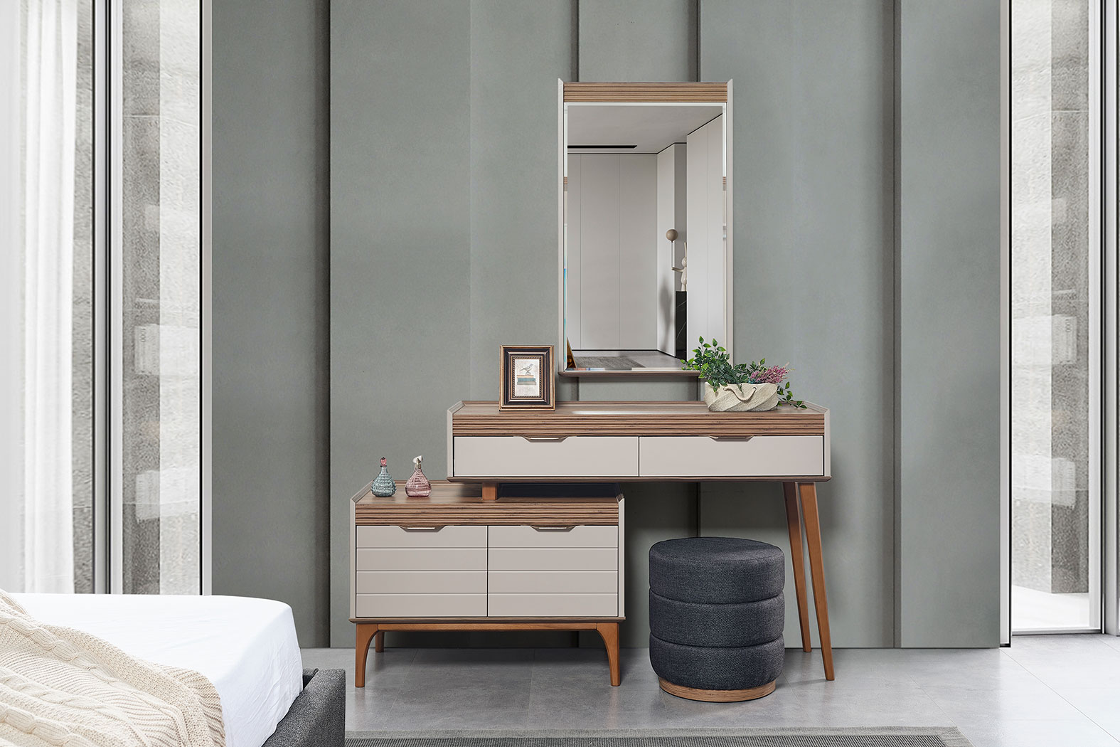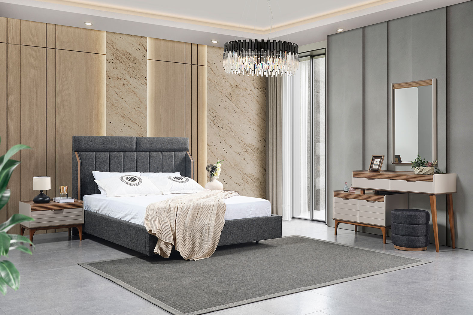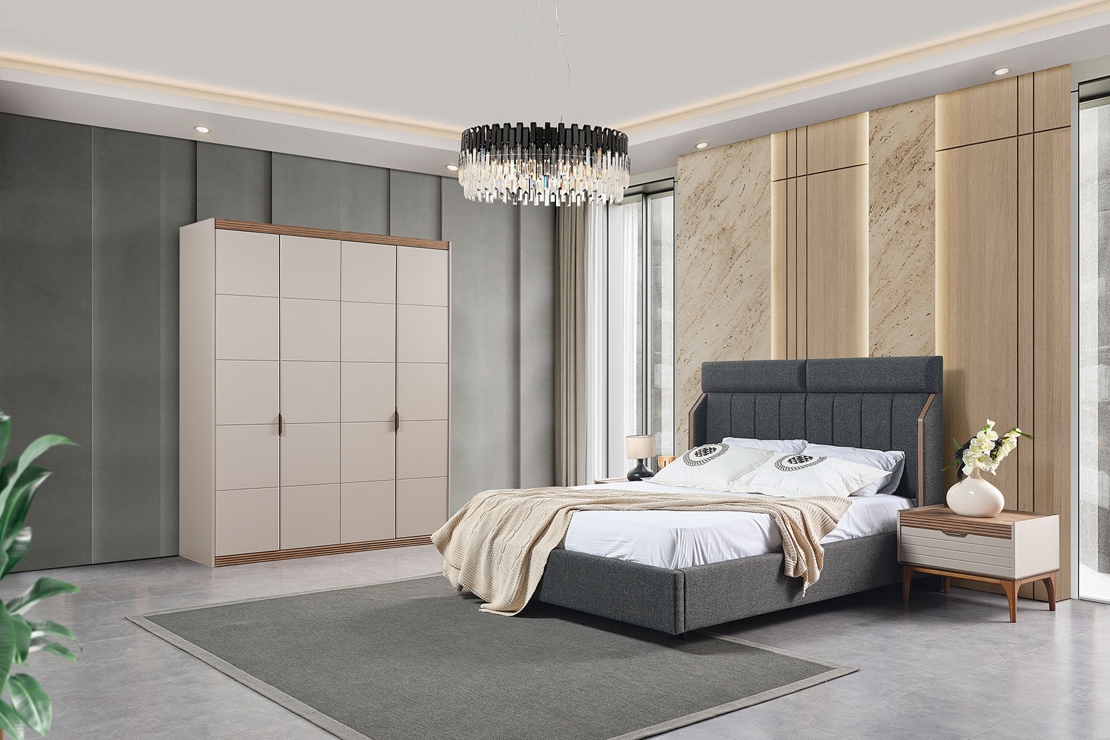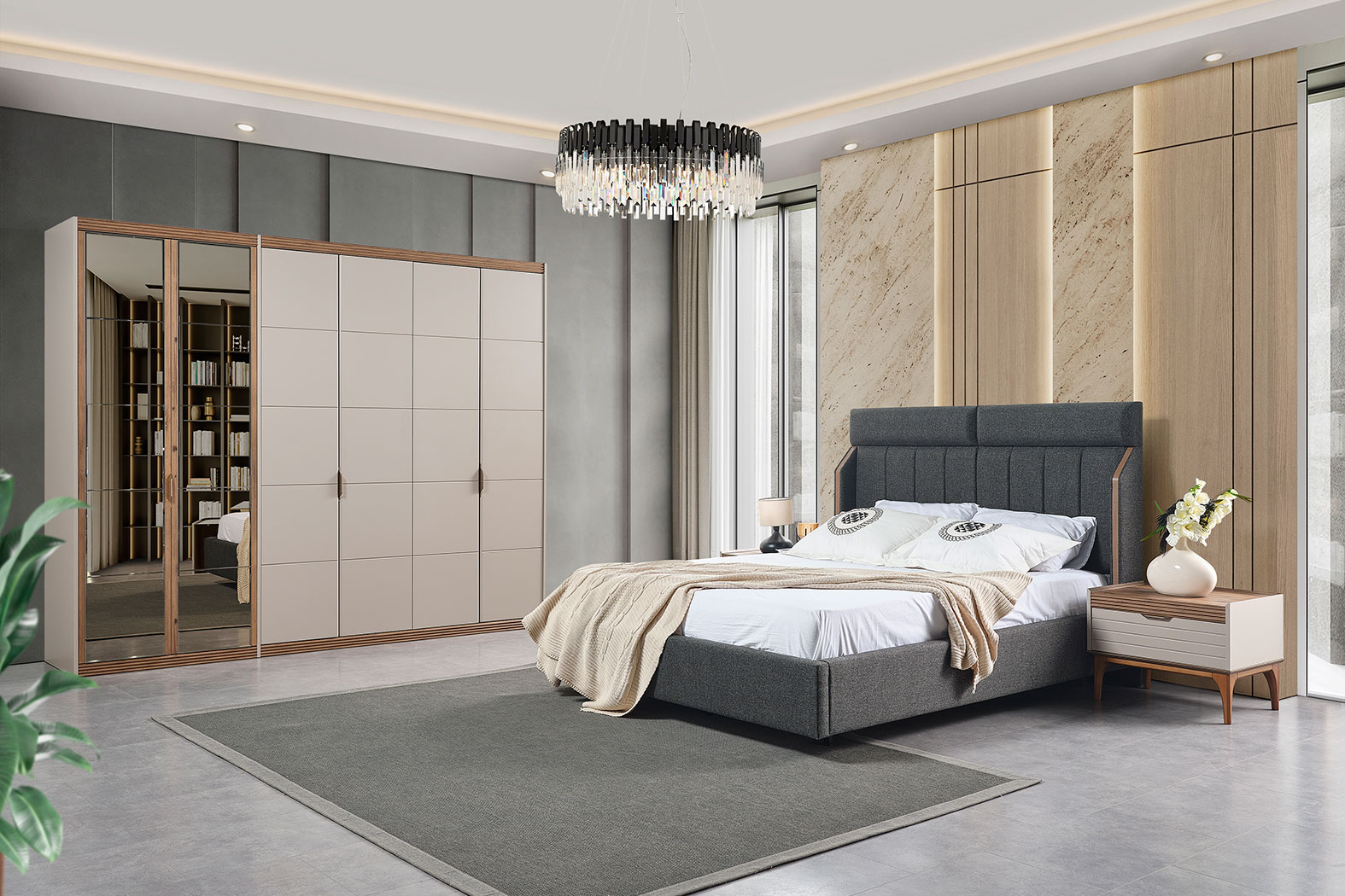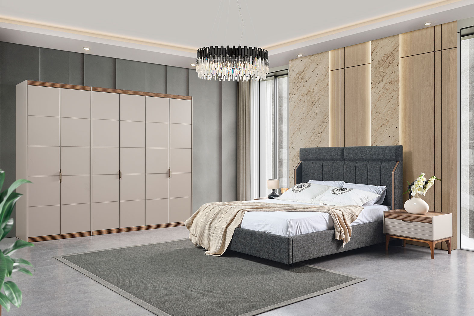 Takim Içerigi | Yatak Odası Takımı, 1 adet gardırop, 1 adet karyola ve başlığı, 2 adet komodin, 1 adet şifonyerden oluşmaktadır. |